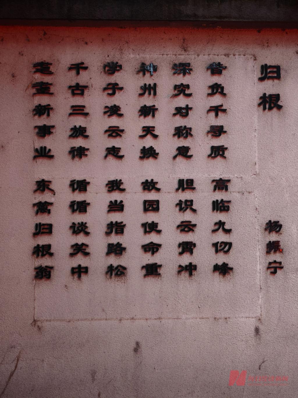 如今,四古巷的墙上,依旧镌刻着杨振宁的诗——《归根》,其中写到:" 神州新天换,故园使命重。学子凌云志,我当指路松。千古三旋律,循循谈笑中。"