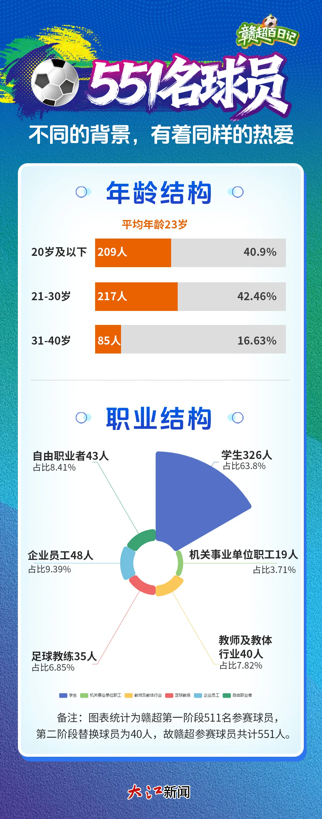 本届赣超11支球队共551名注册球员,均为业余选手,平均年龄23岁。最小的球员为来自上饶队的郑力川,今年17岁。其中,六成是在校学生,其余则是教师、企业员工、厨师、的哥、足球教练等各行各业的普通人。他们不是职业球员,却用每一次拼抢、每一粒进球,诠释着“以球之名,为城而战”的信仰,那滚烫的热爱,让足球回归最本真的纯粹。