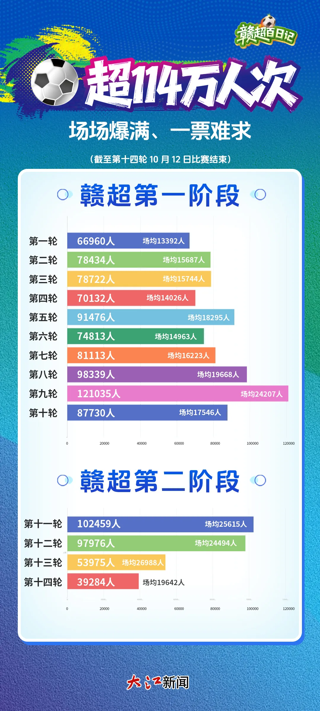 从揭幕战南昌与景德镇的平局开场,到11座城市、62场赛事的轮番激战;从551名草根球员初登赛场,到累计观赛人次超114万、单场观赛人数屡破纪录;从以前赛场的“门可罗雀”,到如今线下“一票难求”。一组组亮眼数据,勾勒出赣超100天的清晰脉络。