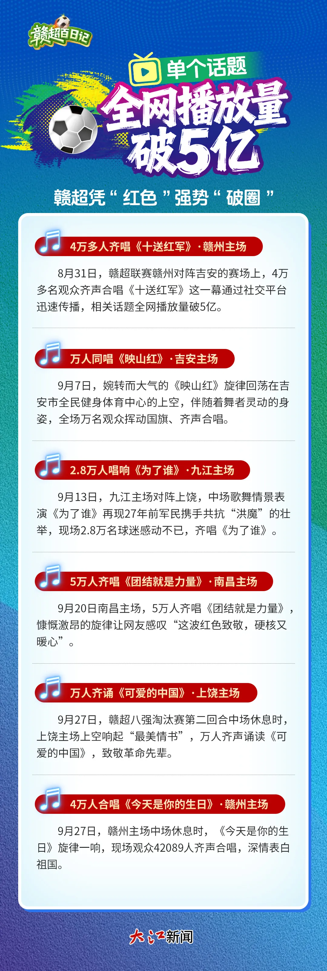 当赣州“鸟巢”4万多人合唱《十送红军》,当吉安全民健身体育中心万人同唱《映山红》的歌声穿破夜幕,当南昌奥林匹克体育中心体育场5万人齐唱《团结就是力量》,红色文化在绿茵场上焕发新生。这些刻在江西人血脉里的红色旋律,经过互联网的广泛传播,实现强势“破圈”。