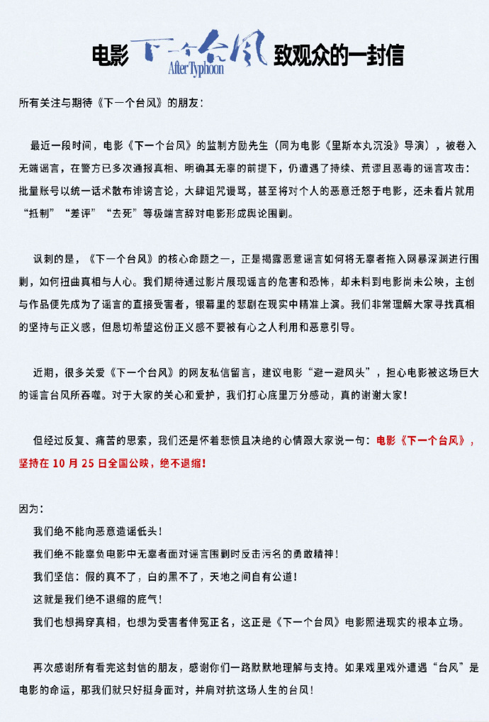 10月18日,影片发布公告称:最近一段时间,电影《下一个台风》的监制方励先生(电影《里斯本丸沉没》导演),被卷入无端谣言,在警方已多次通报真相、明确其无辜的前提下,仍遭遇了持续的谣言攻击。片方提到,近期许多关爱《下一个台风》的网友私信留言,建议电影“避一避风头”。“但经过反复、痛苦的思索,我们还是怀着悲愤且决绝的心情跟大家说一句:电影《下一个台风》,坚持在10月25日全国公映,绝不退缩!”
