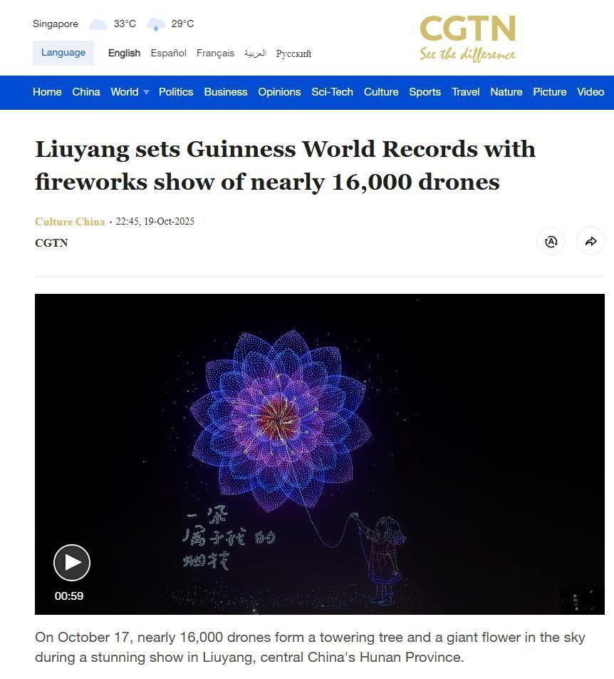 今天 ( 10 月 20 日 ) ,中国国际电视台 ( CGTN ) 也以《Liuyang sets Guinness World Records with fireworks show of nearly 16,000 drones》 ( 《浏阳近 16000 架无人机烟花秀创造新的吉尼斯世界纪录》 ) 为题报道此事。