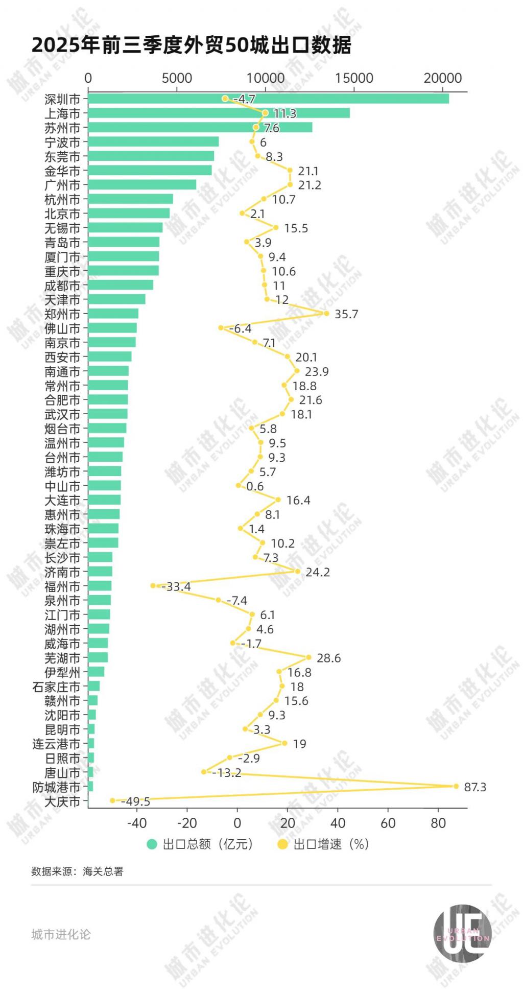 一位广东区域经济研究专家告诉城市进化论,这背后也反映出广东产业结构加速调整,像深圳的新能源汽车、人工智能和无人机等产品出口增长迅猛,同时当地又积极从传统市场转向东南亚、中东等新兴市场,外贸发展更具韧性。