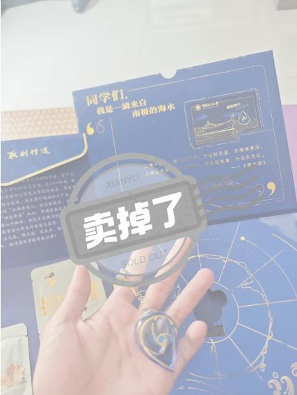 " 蓝色水晶材质,金色边框典雅大方。成色完好。吊坠配有精美礼盒包装,内含南极海水纪念卡片。送礼自用都很合适。" 闲鱼 App 上,一条中国海洋大学录取通知书所附赠的南极海水吊坠前不久刚刚被人拍下,链接显示为 " 已售 " 状态,售价为 1299 元。
