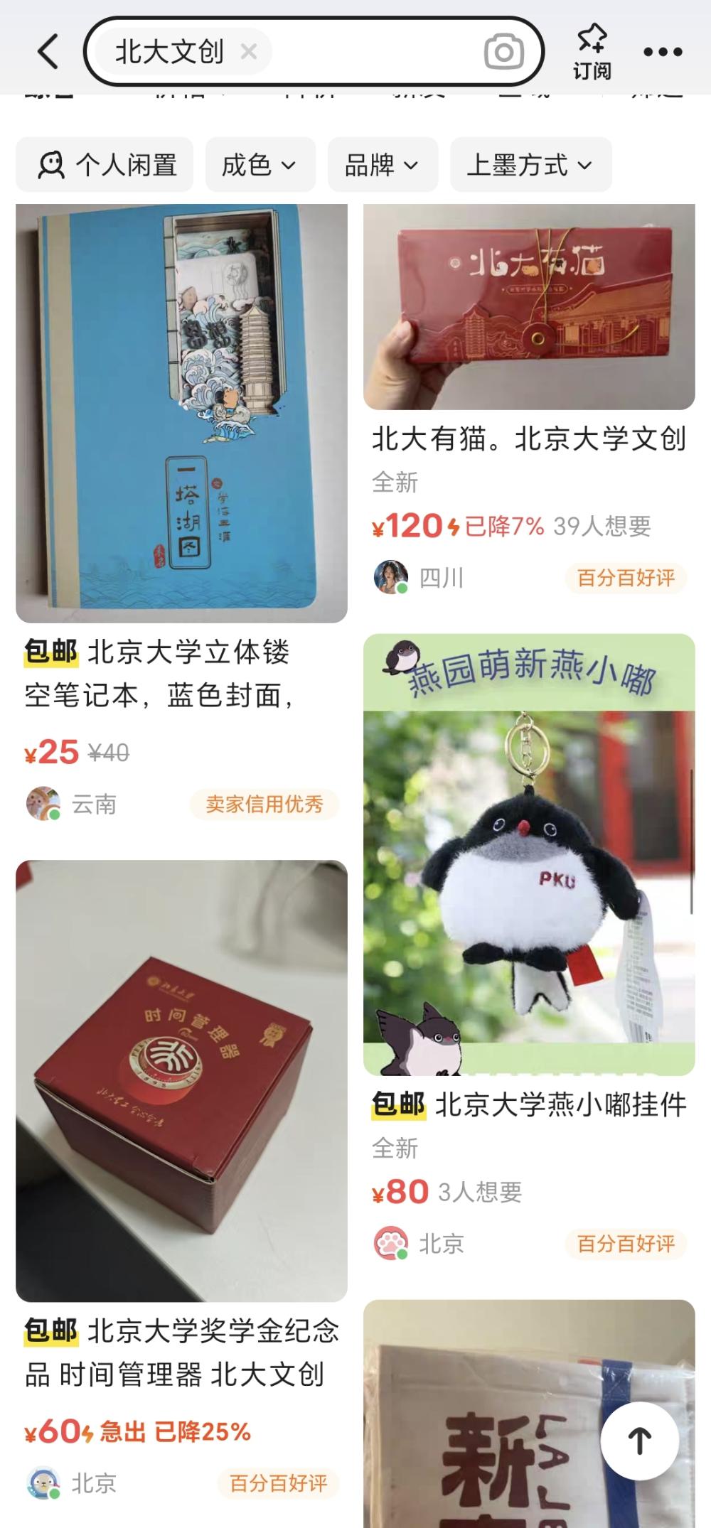 在二手平台上搜索 " 北大文创 ",还能找到校内奖学金的纪念品。(图 / 二手平台截图)