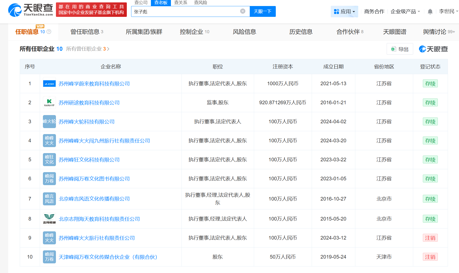 天眼查显示, 张雪峰(张子彪)名下共关联10家企业,其中8家为存续状态,包括苏州峰学蔚来教育科技有限公司、苏州研途教育科技有限公司、苏州峰火轮科技有限公司、苏州峰峰火火闯九州旅行社有限责任公司、苏州峰狂文化科技有限公司等,版图涉及教育科技、文化传播、旅行社等。