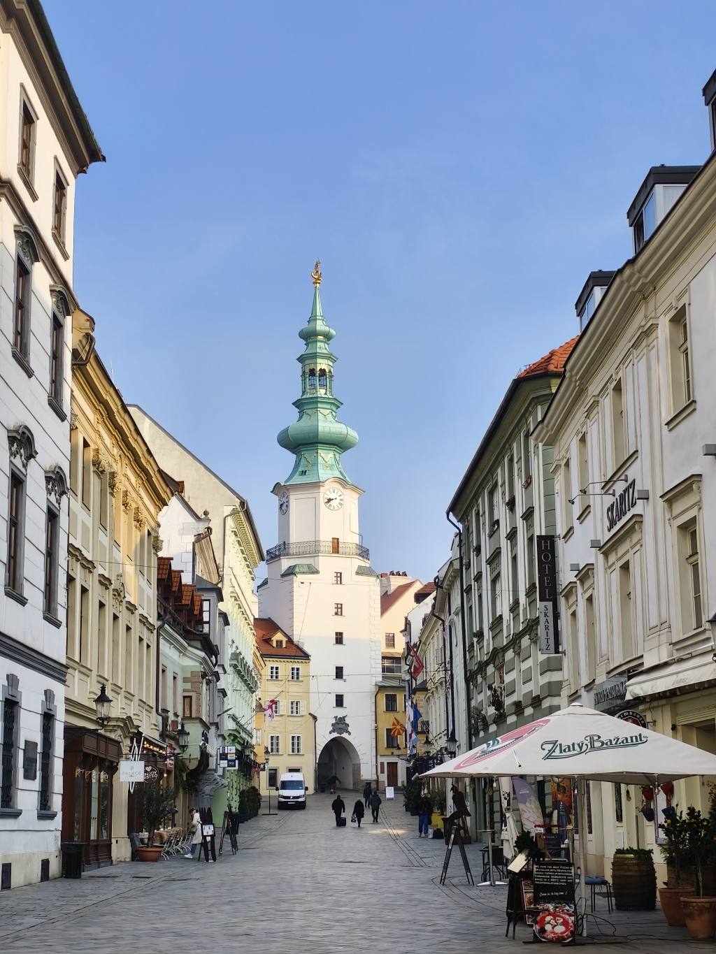 没多远便可到达老市政厅广场。老市政厅建于1421年,最初用于防御,12世纪时曾是市长住宅的一部分。1805年,率军围攻布拉迪斯拉发的拿破仑与神圣罗马帝国皇帝在此签订《普莱斯堡和约》。