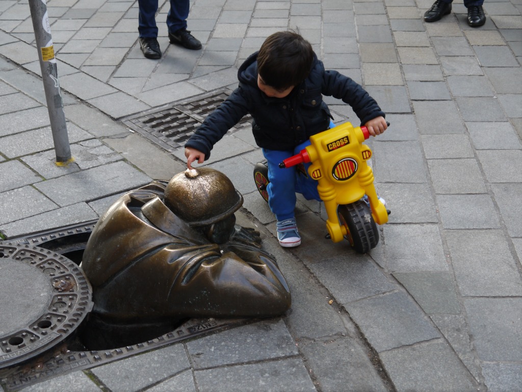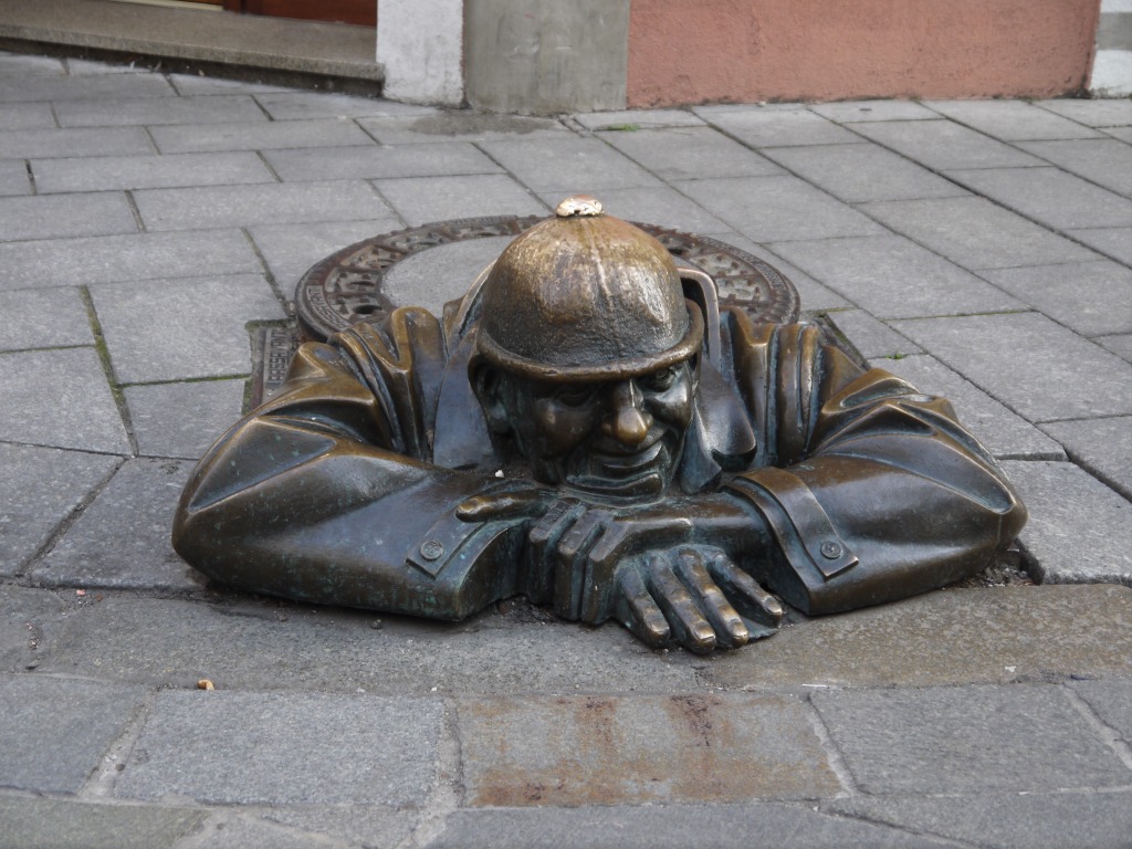 老城遍布各种雕像,最著名的当属“工作中的人”,它“偷偷摸摸”呆在人行道边,只露着戴头盔的脑袋,正从沙井盖处爬出来,神态悠然自得,还带着一丝微笑。