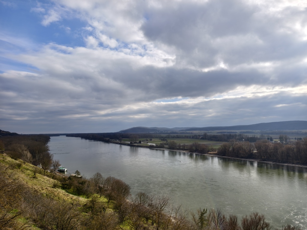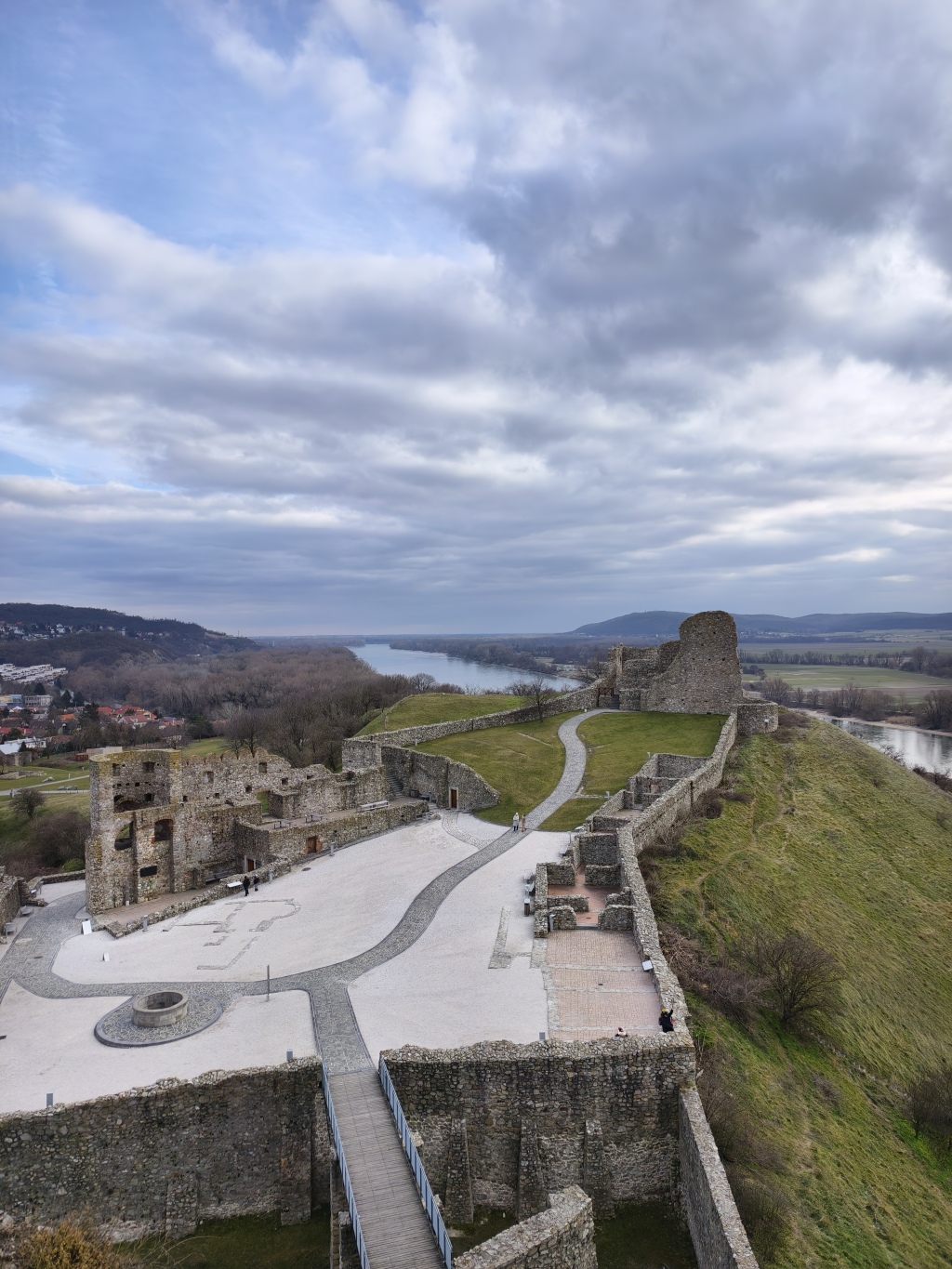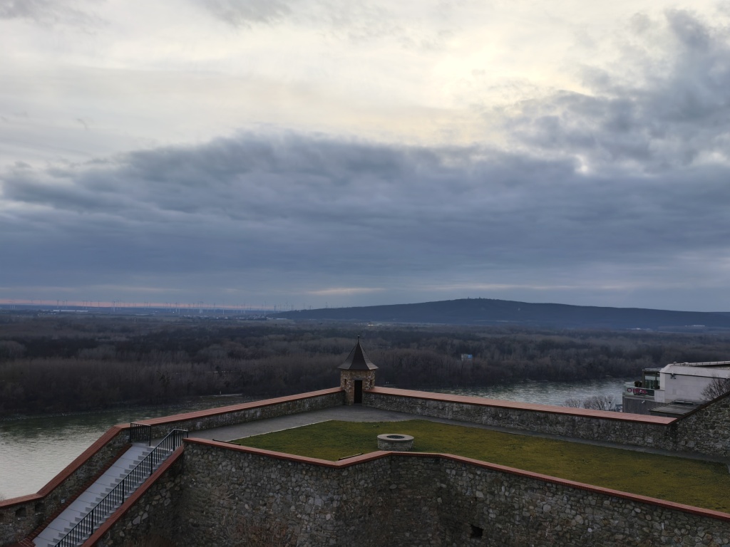 站在德文城堡最高处的观景台,眼前的多瑙河和摩拉瓦河静静实现交汇,可以见到斯洛伐克与奥地利的边境。极低又极厚的云层,虽然没有蓝天白云带来的澄澈感,却与眼前河流色调相近,在远方融为一体。