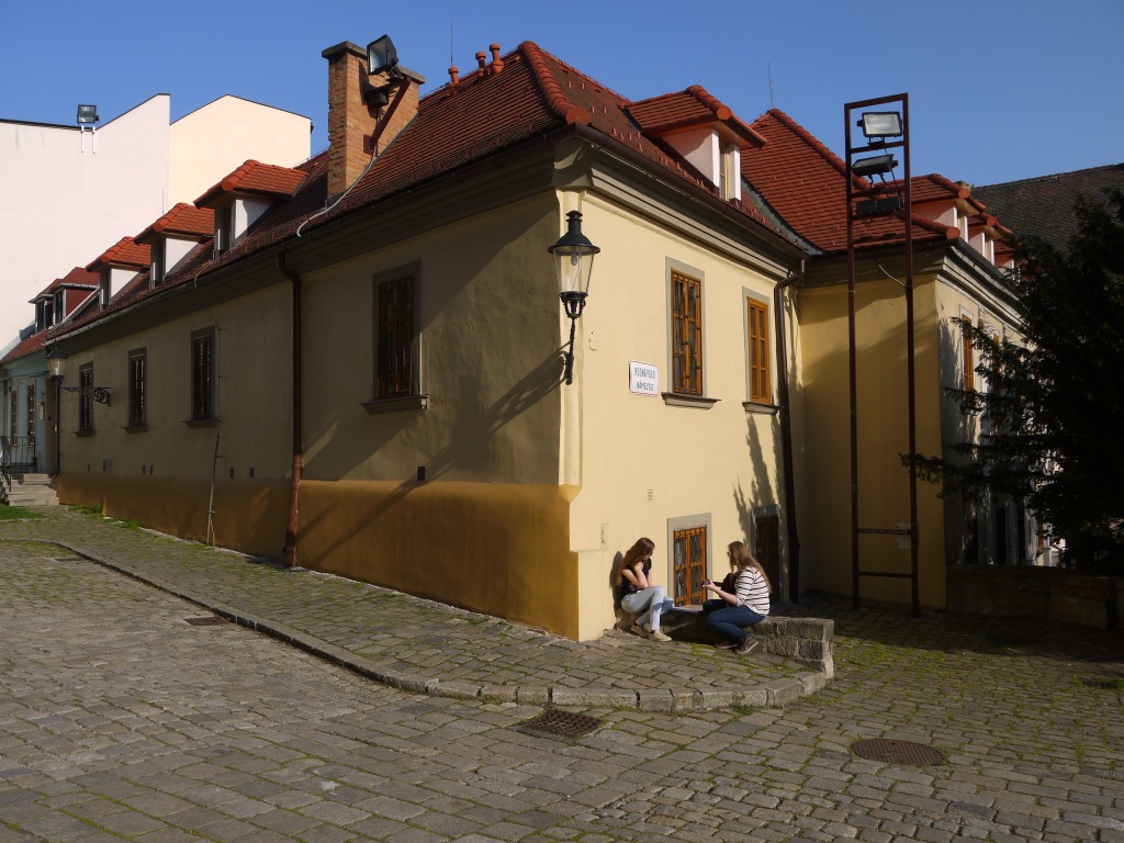 教堂侧面建筑旁有一片小草地,人们在草地旁的长椅上坐着聊天、看书,孩子们在草地上嬉戏,一个帅气男孩在两个小女孩面前耍帅,看似收效不错。教堂背后的斜坡广场以鹅卵石铺地,环绕一圈低矮的老建筑。一栋黄色外墙小楼下有两个对坐的年轻女子,一个弹吉他,一个轻吟浅唱。我顺手拍了张照片,得到的是二人的灿烂笑容和友好点头。