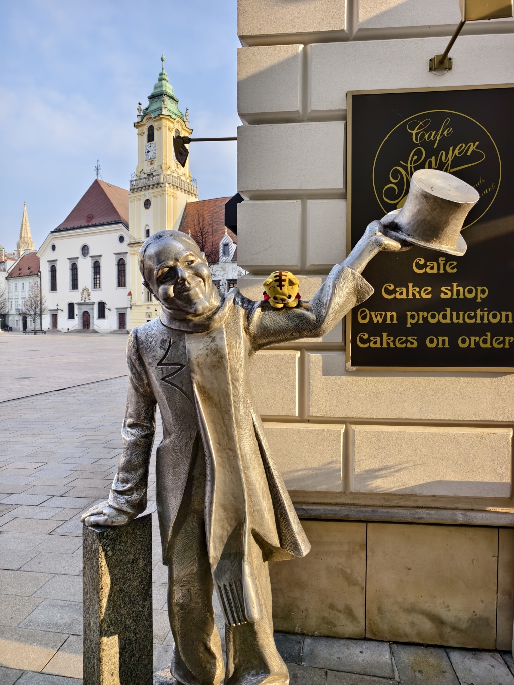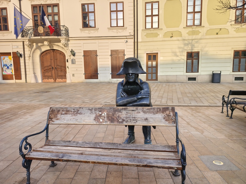广场有一座军人雕像,头戴深檐军帽,身穿军大衣,躬身伏在长椅上,笑着望向来往行人。因为个头不高,许多人认为它就是拿破仑。但实际上,它是一位法军士兵。因为太迷恋布拉迪斯拉发,所以不想离去,便永远留在了广场上。