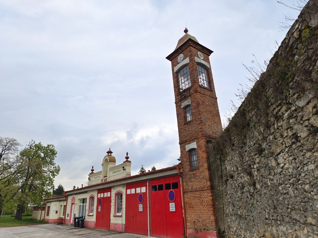 几十米外还有一道斑驳的古城墙,当地消防局建筑与古城墙相连。主建筑上方是巴洛克式对称山墙,消防车库旁有一座高耸的红砖钟楼,四面钟下是四面长条玻璃窗的观察屋,这座昔日的望火楼,曾长年守护城市安全。