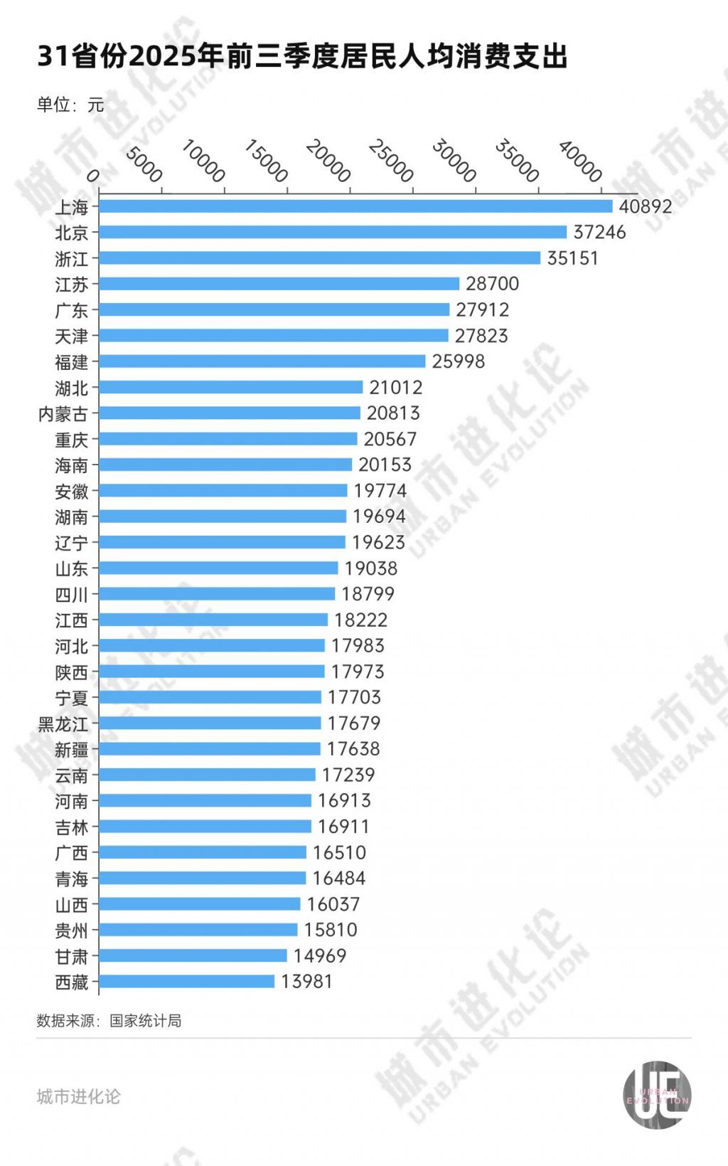 如今年前三季度,上海人均消费支出达到 40892 元,在 31 省份中排名第一,也是唯一超过 4 万元的省份。