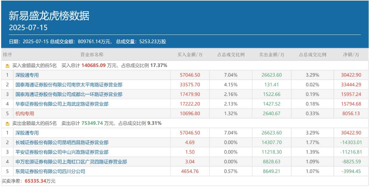 7月17日披露的3日龙虎榜数据显示,有5个机构专用席位累计买入新易盛39.25亿元,同时累计卖出该股20.7亿元,累计净买入金额为18.55亿元;深股通专用席位则在买入该股39.91亿元的同时卖出27.83亿元,净买入金额为12.08亿元。