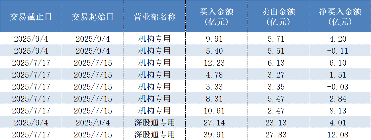 9月4日披露的龙虎榜数据显示,两个机构专用席位累计买入新易盛15.3亿元,同时累计卖出11.22亿元,累计净买入金额为4.09亿;深股通专用席位在买入27.14亿元的同时卖出23.13亿元,净买入金额为4.01亿元。