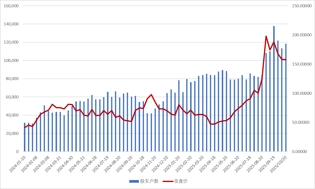 随后,天孚通信的股价开始有所调整,其股东户数却在继续上升,截至9月19日,公司最新的股东户数相较于8月29日累计增加2.98万户。近期该股股价调整幅度加大,其股东户数有所下降,但是截至10月20日最新股东户数依然高达11.85万户。