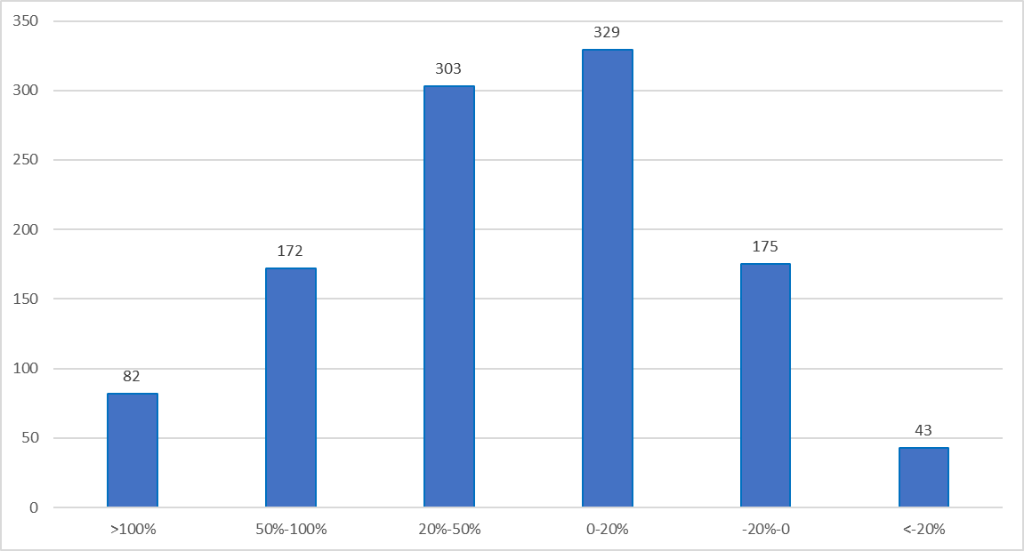 科技行业内部同样分化剧烈,Wind数据显示,以申万一级行业分类为参考,截至10月23日,隶属于TMT行业(即电子、计算机、传媒、通信)的1104只个股中,只有82只个股年内涨幅超过100%,占比7.43%;有接近一半的个股年内涨幅不足20%,其中218只个股年内股价下跌,占比19.76%。