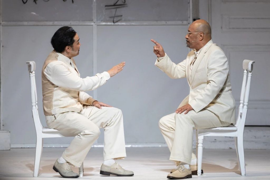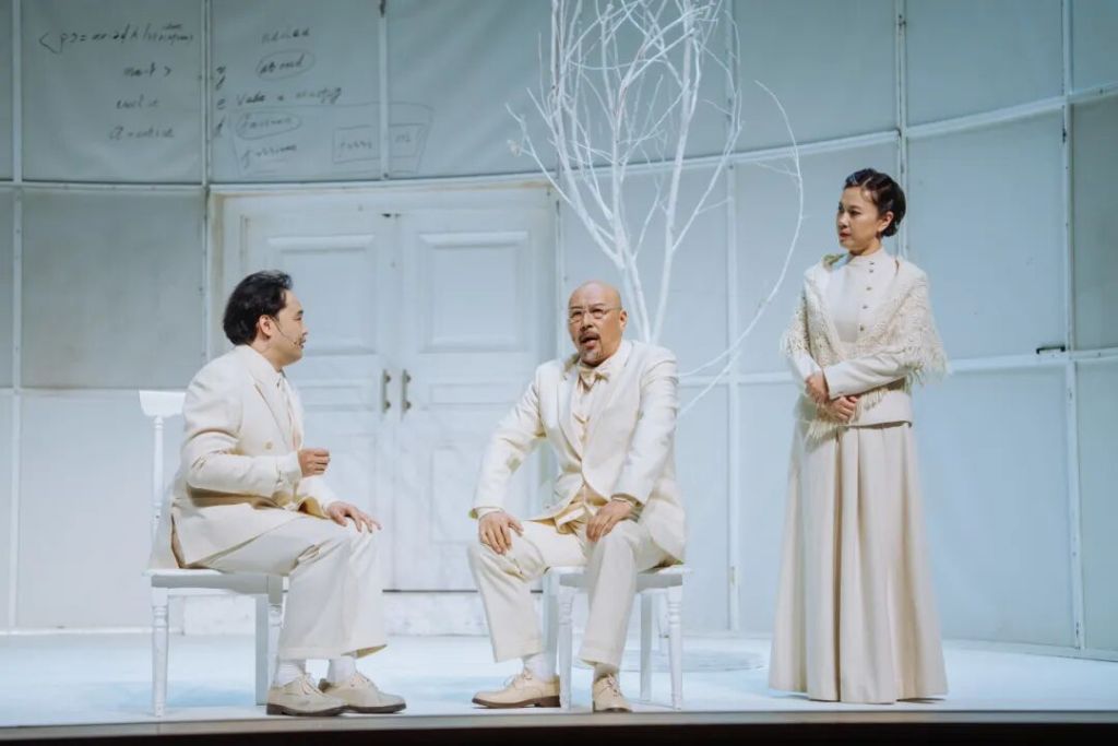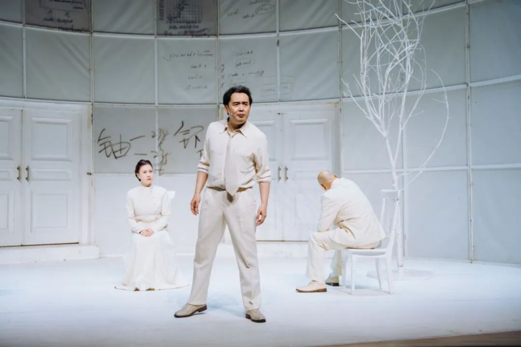 国话版《哥本哈根》以“纯白舞台”构建视觉与哲学的双重仪式。几把白色椅子、一道弧形背景墙和冷调光线,勾勒出极简而高度象征性的美学空间。“白色既是原子弹爆发后的‘归零状态’,也象征灵魂的纯净与历史的空白。”王晓鹰此前在接受澎湃新闻采访时强调,这一设计旨在打造“纯粹的理性空间”,让演员如灵魂般飘浮于时间之外。