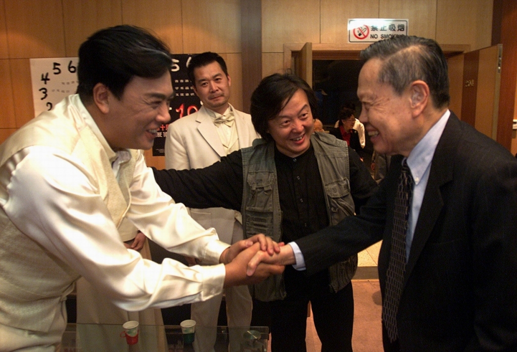 杨振宁走进后台,在王晓鹰导演的介绍下,同主演梁国庆等亲切握手交流