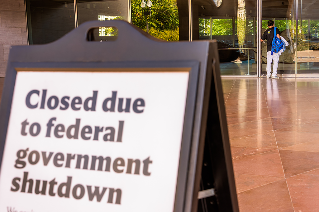 2025年10月6日,美国华盛顿,一名男子透过美国国家美术馆的窗户向内张望。由于美国国会未能就上周的拨款协议达成一致,政府继续停摆,该美术馆已关闭。视觉中国 资料图
