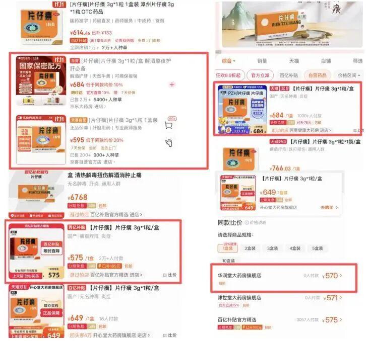 美团平台显示,美团自营大药房(快递电商)价格为 629 元 / 粒,优惠前价格为 1200 元 / 粒,显示已经销售 4000 余件,评论区有不少消费者表示经过扫码验证为正品,性价比高。而在天猫平台,片仔癀锭剂的售价为原价 760 元 / 粒,拼多多平台为 609 元 / 粒。