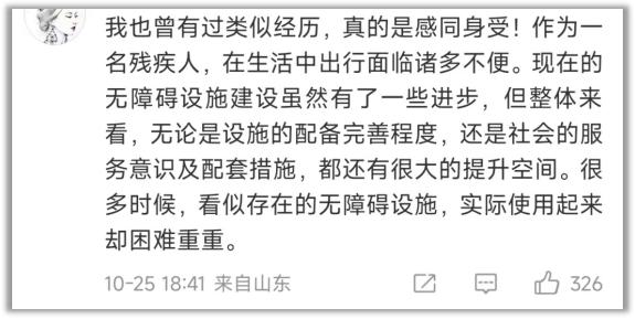 有过类似遭遇的残障人士也借此机会出来吐槽“出行难”。
