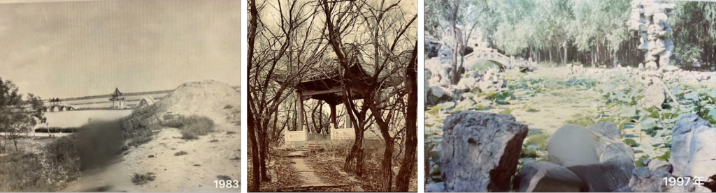 景观提升目标下,人与非人主体协作对水生态环境的改善。左:“挖湖堆山”初期的小山包;中:小山包越堆越高,种植树木,修建沧浪亭;右:“挖湖堆山”不经意改善水质的条件下成功引种荷花,荷花持续改善水生态环境。(来源:网络)