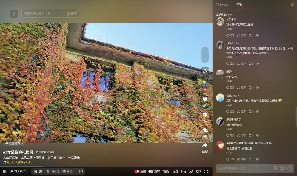对于本地居民与离乡用户而言,他们的怀旧叙事与身份认同的维系,同时受到物质实体与平台算法的双重塑造。当抖音up主“Muchpaiiin”拍摄到公园溢芳楼内剥落残破的墙壁时,平台的内容分发机制将这一影像精准推送给了已离乡的天津用户,触发了他的回忆:“一楼有假山小桥流水……楼上还有大型游戏机。最最喜欢的就是西游记壁雕生动有趣……”。此刻,斑驳的墙壁作为非人行动者,成功地将离乡者的个人记忆“转译”为可供集体分享的公共文本。