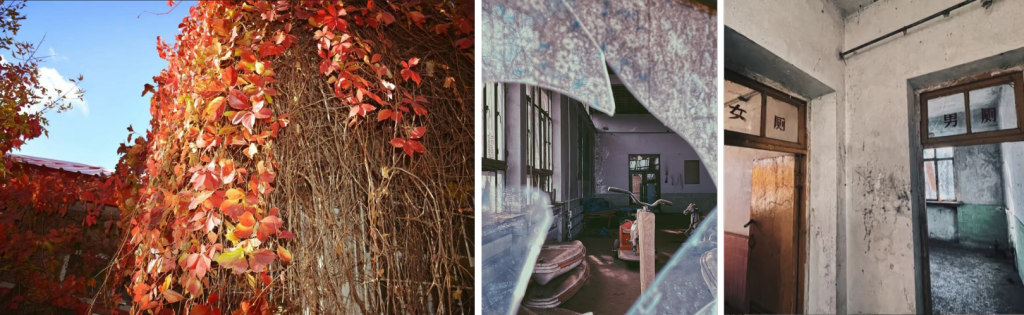 室内空间的原有秩序几近坍塌。爬山虎层层包裹立面并随季节变化重写建筑表皮;破窗引入气流与尘埃,停摆的采暖与通风使湿度与温差主导材料老化,霉菌与蛛网在自然光难以抵达的角落栖息拓展……