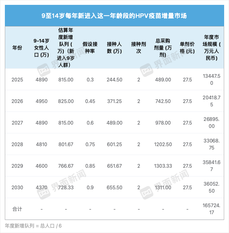 国家免疫规划市场主要由两部分组成:一是针对9至14岁适龄女生的存量市场,二是每年新进入这一年龄段的增量市场。