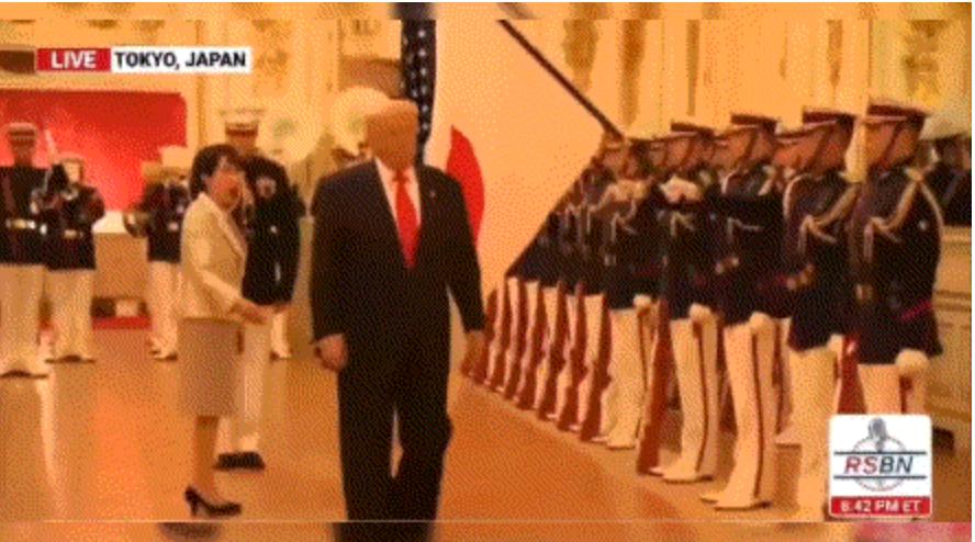 先是见面环节。高市早苗将与特朗普的初次见面安排在东京元赤坂的迎宾馆,并安排了阅兵环节。但短短一分钟的室内阅兵却环节错漏频发。在向美国国旗敬礼之后,特朗普直接忽略日本国旗,自顾向前走,高市早苗只能匆忙向仪仗队方向鞠躬,然后尬笑追赶。