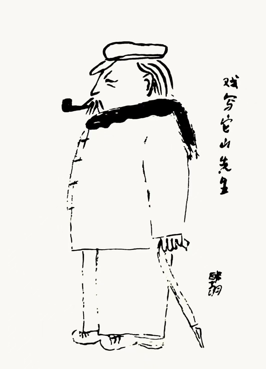 韩羽画过一幅《戏写它山先生》,是笔者见过张仃造像中最传神、最精妙的一幅。它以简练轻松的线条,画出一个质朴潇洒、童趣十足的老艺术家,稳重厚实而不失灵慧,形体夸张“几乎达到荒谬的程度”(张仃评韩羽戏曲人物画之语),却令人感到异常的真实、亲切,非如此不可;脸部神态的表现,明显参考了张仃的自画像,而表情生动的帽子、烟斗、围巾,还有那支与文心相通的奇妙手杖,则纯出韩羽的匠心。看得出,韩羽是怀着深挚的感情与默契创作这幅画的,其中也投射了韩羽自己的身影与风采。