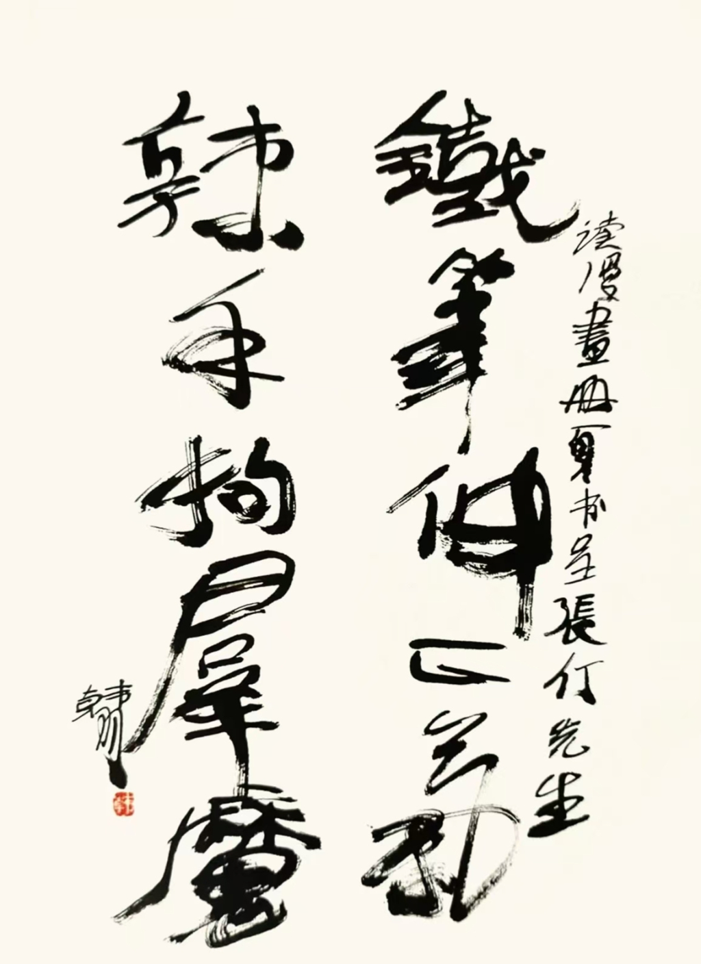 于是,张仃撂下正在兴头上的焦墨山水探索,画起已搁笔二十年的漫画来。不久,一组以鲁迅的“立此存照”为题,讽刺“四人帮”的漫画问世,深邃的思想,高超的技艺,使它熠熠生辉,在汗牛充栋的同类题材漫画中显得卓绝不群。——这个过程,韩羽都亲眼见证,不仅亲眼见证,甚至参与其中,请看他为此漫画册的题字——“铁笔伸正气,辣手拘群魔。”笔墨遒劲奇崛,酣畅淋漓。