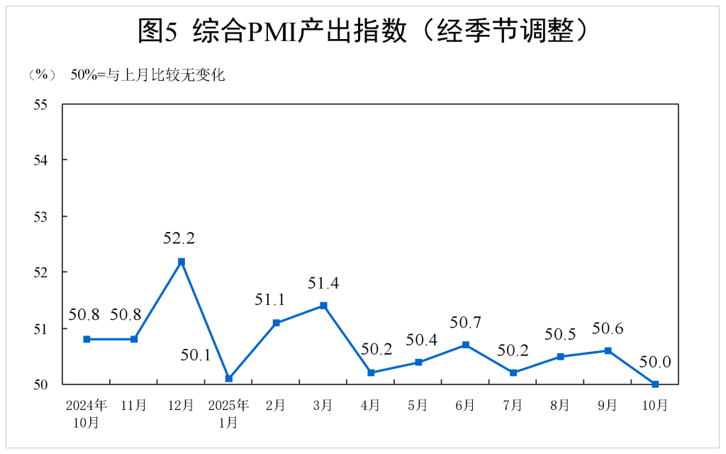10月份,综合PMI产出指数为50.0%,比上月下降0.6个百分点,位于临界点,表明我国企业生产经营活动总体稳定。