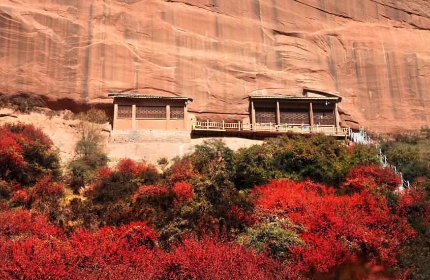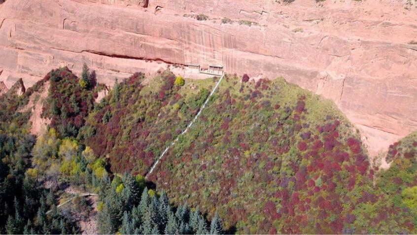 开凿于红砂崖壁上的金塔寺石窟,要上去得爬 240 级台阶