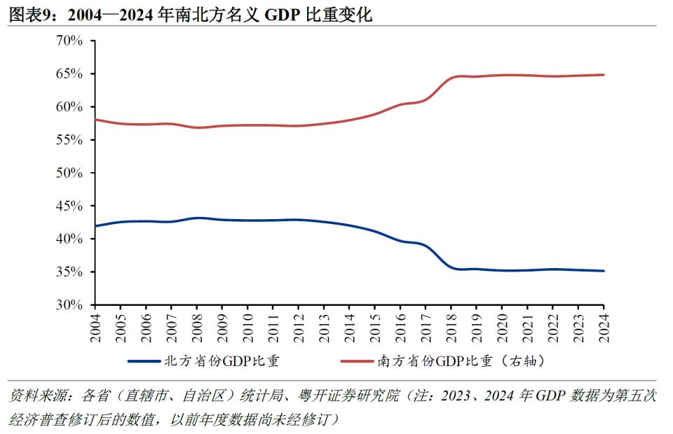 数据显示,北方省份 GDP 占比从高峰时期的 42.9% 降到 35.3%,南方地区则进一步上升到 64.8%。