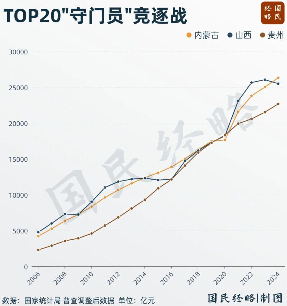 过去 10 年来,贵州、山西、内蒙古轮流成为省域经济 TOP20" 守门员 "。