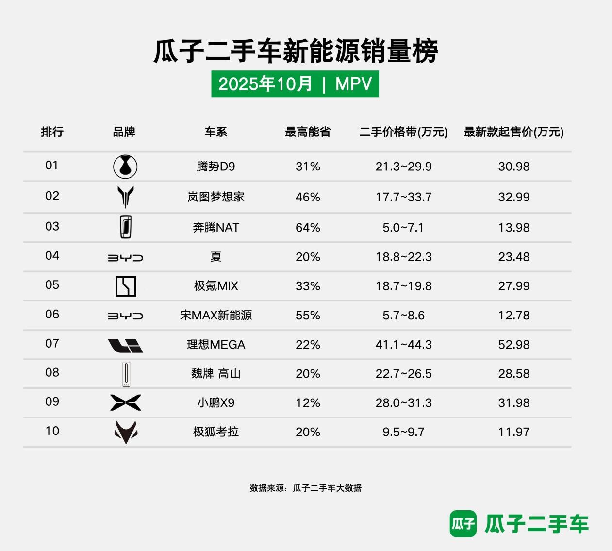 MPV细分市场呈现出差异化竞争态势。腾势D9本月跃居首位,21.3-29.9万元的价格区间配合31%的“最高能省”比例,显示出在高端家用及商务市场的吸引力。奔腾NAT以约5万元的入门价格和64%的“最高能省”比例,成为网约车及工具型用户的首选。新晋车型极狐考拉以9.5万元起的二手价格切入家庭用车细分市场,而岚图梦想家则通过拓宽至17.7-33.7万元的价格带,巩固其在商务及家用双领域的市场地位。