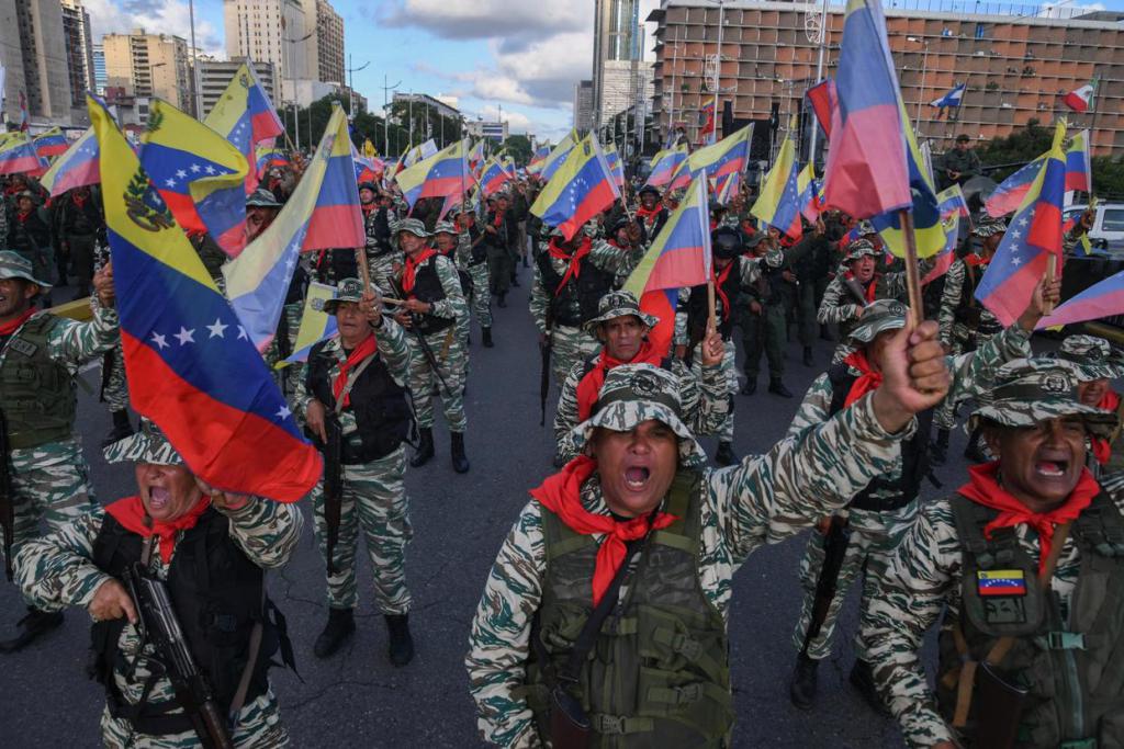 9 月 23 日,在委内瑞拉首都加拉加斯,民兵组织成员挥舞委内瑞拉国旗参加游行。新华社发(马科斯 · 萨尔加多摄)
