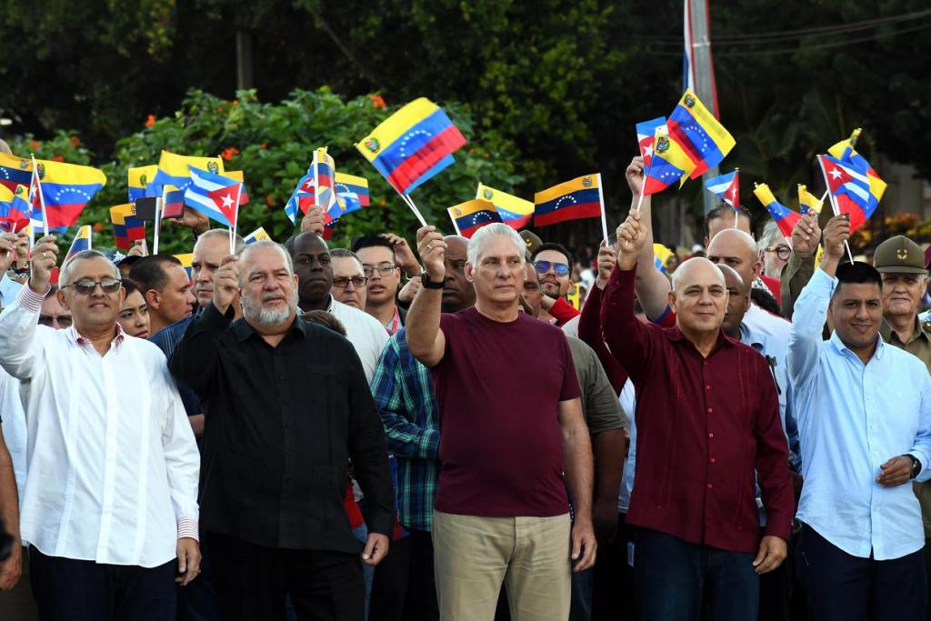 10 月 17 日,5 万多古巴民众聚集在首都哈瓦那总统大道的西蒙 · 玻利瓦尔雕像前,抗议美国军事威胁委内瑞拉,表达对委内瑞拉人民和政府的坚定支持。古共中央第一书记、古巴国家主席迪亚斯 - 卡内尔(前左三)等古巴党政领导人以及委内瑞拉全国代表大会第一副主席佩德罗 · 因方特(前右一)出席集会。新华社发(华金 · 埃尔南德斯摄)