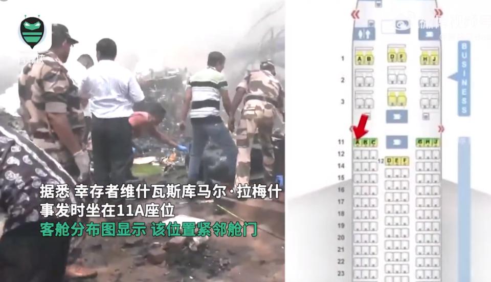 拉梅什的座位号是 11A 座,紧挨舱门。印度媒体播出的画面显示,他还能走路、说话,脸上和身上有明显伤口。
