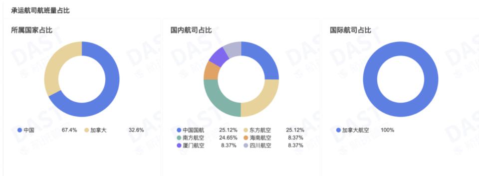 目前执飞中加航线的内地航司主要有 6 家,分别是国航,东航,南航,厦航,川航和海航,疫情前曾飞加拿大的首都航空尚未恢复中加航线,而加拿大方面只有加拿大航空一家在飞。