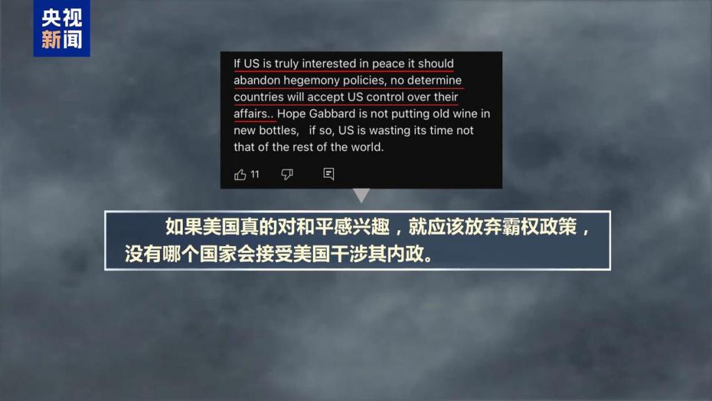 对于加巴德的言论,有网友评论说,如果美国真的对和平感兴趣,就应该放弃霸权政策,没有哪个国家会接受美国干涉其内政。还有网友评论说,美国不要再多管闲事,不要满世界推广所谓的“民主”,而是让各国自己做主,就是帮世界最大的忙了。