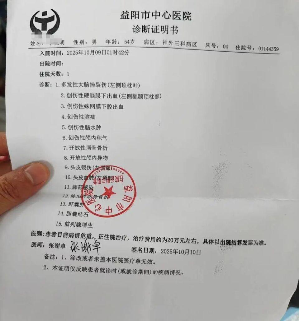 目前,李斌已住院治疗 20 多天,依旧处于昏迷状态。他的入院报告显示,他在 10 月 9 日 1 点 49 分被送往益阳市中心医院,被诊断为多发性大脑挫裂伤(左侧顶枕叶)、创伤性硬脑膜下出血、创伤性脑水肿、开放性顶骨骨折、开放性颅内异物;患者病情危重,治疗费用约 20 万元左右,具体以出院结算发票为准。
