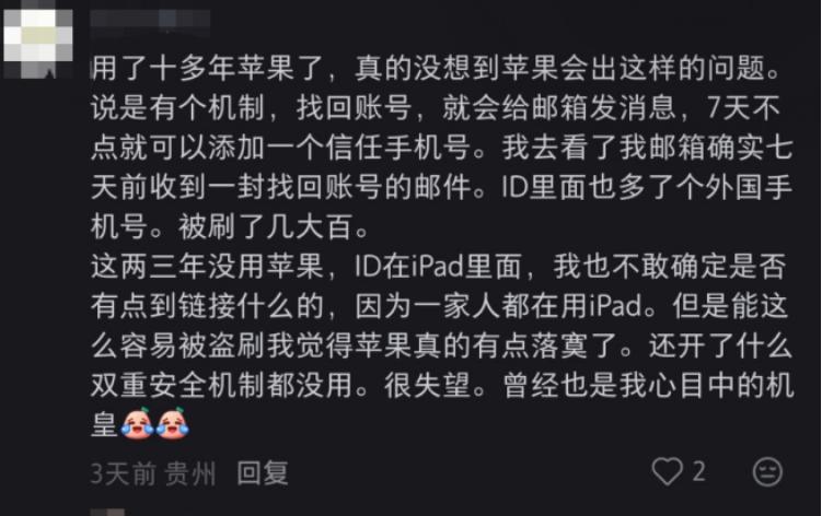 声称苹果 ID 被盗刷的用户发帖 图片来源:网络平台截图