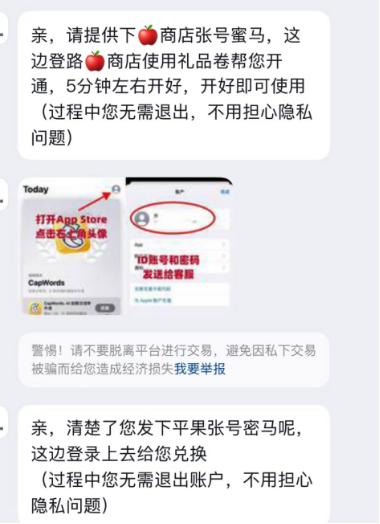 沟通中,卖家首先确认了冯平使用的是苹果手机,再以 " 需绑定苹果账号激活 " 为由,让其提供 ID 和密码。" 我犹豫了一下,问‘为什么要密码’,对方说‘苹果设备都这样’。" 冯平想到,自己平时购买商品付费时还需要进行人脸识别,觉得 " 应该没太大风险 ",便将相关信息发送了过去。