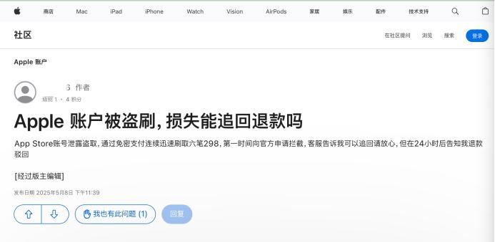 每经记者注意到,在苹果官方网站的社区中,有不少关于 ID 被盗刷和希望能追回损失的帖子。