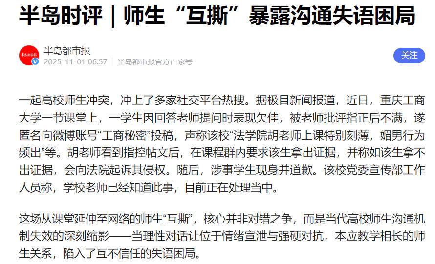 工商大学女生挂老师媚男,结果老师直接起诉。好多人说小题大做,能不能各退一步道歉了事。