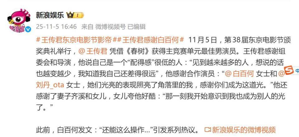 王传君获东京电影节影帝,获奖感言感谢白百何