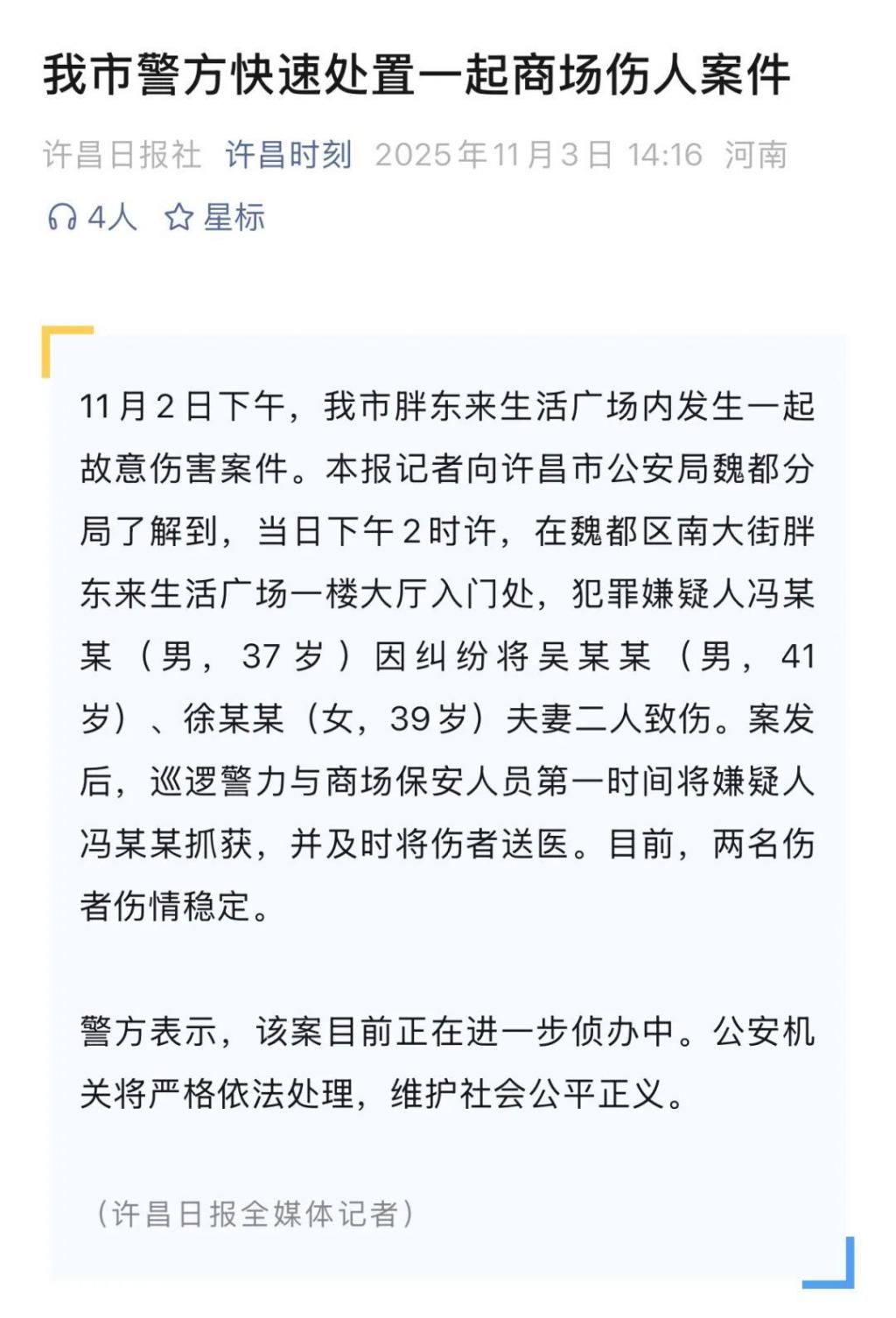 11 月 3 日,许昌日报社官方账号 " 许昌时刻 " 发文 " 我市警方快速处置一起商场伤人案件 ":